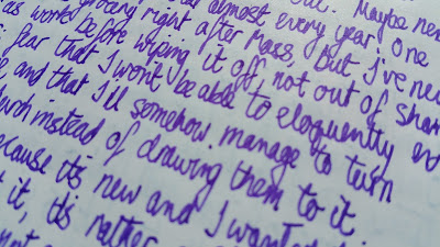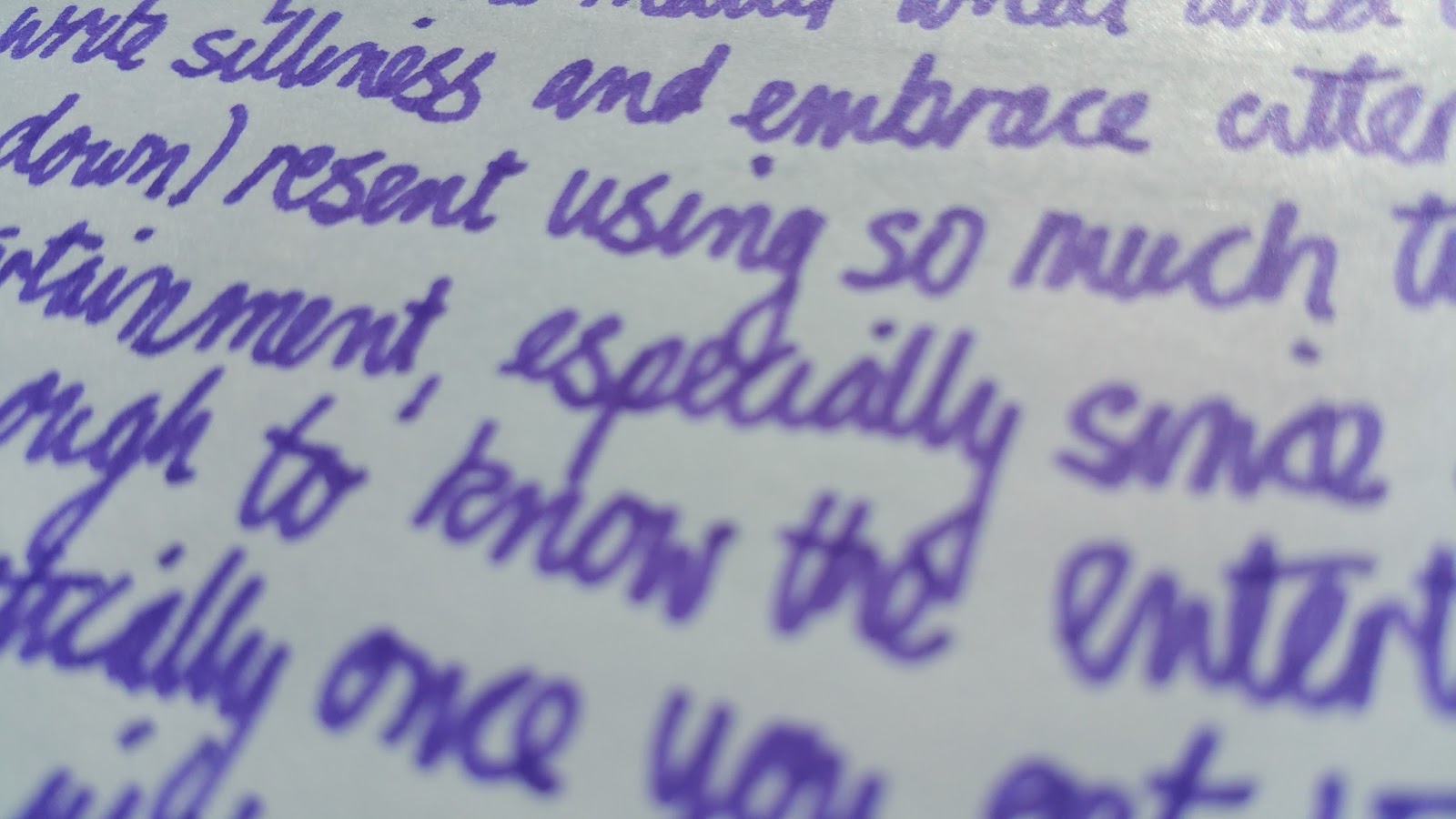 Continuing the theme of liking inks I shouldn't and disliking those I should, I (a firm believer in permanent and water resistant inks) love with this ink. It is silky smooth, has a perfect amount of blue to the color (I prefer violet leaning purples) and is so vibrant I could kiss it.