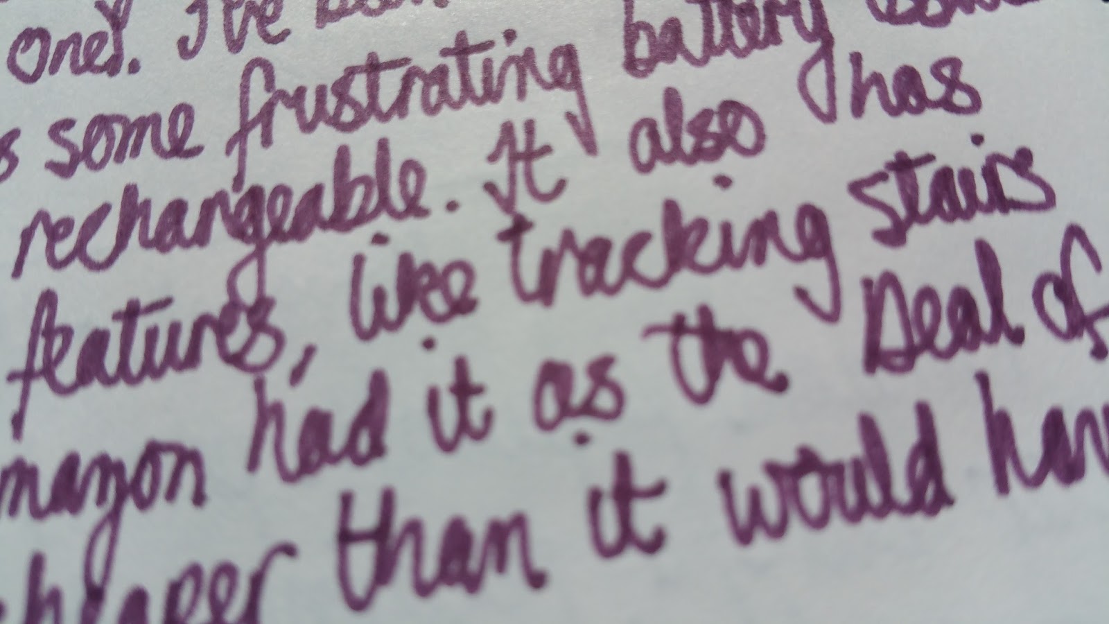 I'm not sure if I could live with this ink, but I like it an awful lot. My perfect purple would be this color, but with at least enough water resistance to leave me something to trace. I ended up ordering Noodler's North African Violet to fill that role. It's not a perfect match and it doesn't have the silky smooth nib feel of the Waterman, but it is a vibrant purple with strong water resistance.