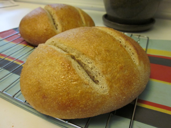 There are all sorts of fancy ways to make sourdough bread, with all sorts of ingredients. The vast majority of the time, however, I opt for the very simplest of "recipes:" A day or two before I plan to bake bread, I get my starter out of the fridge, add about a cup and a half of water and enough flour to make a ball of wet goo, let it sit overnight until bubbly, spoon a little of it back into a container and add flour (this being the starter I keep), and add a spoonful of salt and enough flour to make dough to the rest. I knead it awhile on a floured surface, divide into two round loaves, and let rise on a cookie sheet, sometimes all day. Then I slash the tops and bake at 450 degrees for about 30 minutes.